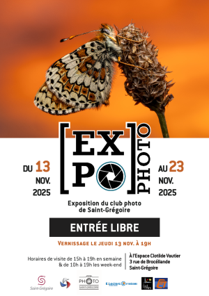 Le photo club de Saint-Grégoire vous invite à son exposition du 13 au 23 novembre 2025 à l'Espace Clotilde Vautier - 3 rue de Brocéliande à Saint-Grégoire.